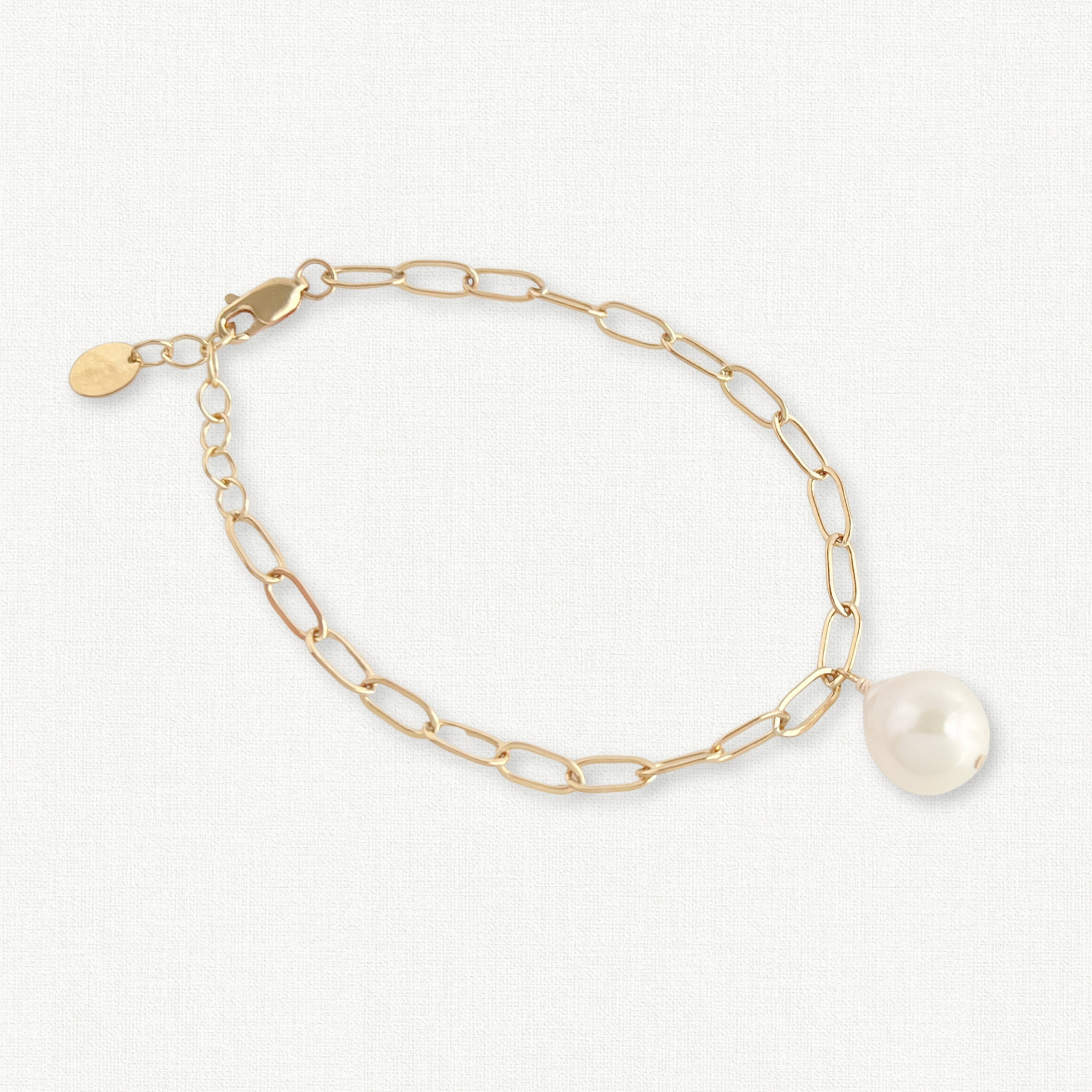 Bold yet romantic, this Raja bracelet showcases a luminous 11–12mm baroque pearl suspended from a modern paperclip chain.