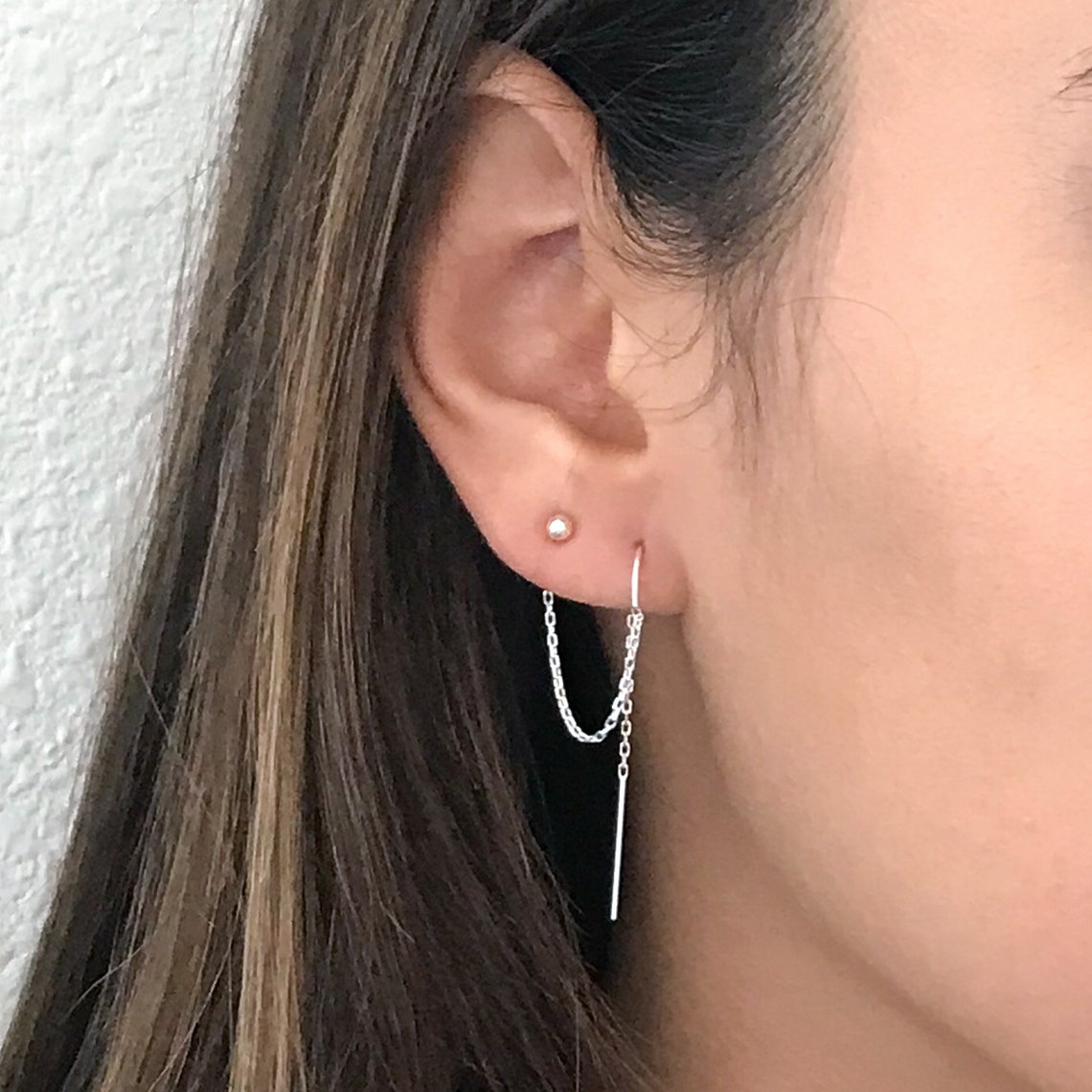 Double piercing earrings featuring a dainty ball post and elegant chain threader, connected at the earring back